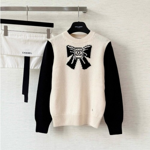 샤넬 25N 코코네쥬 풀오버 리본 CC로고 캐시미어 니트 울 투톤 에크루 블랙 P79718 Y